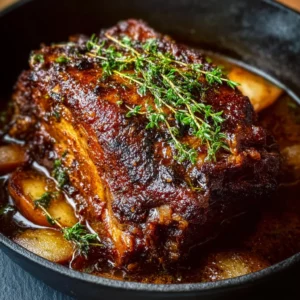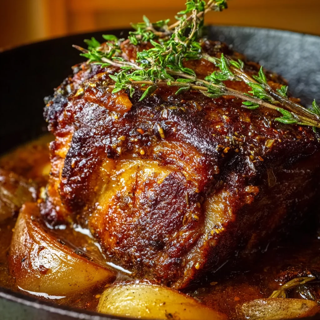 Both thyme and rosemary are key herbs in this recipe, giving the pork shoulder its deep, earthy flavor.