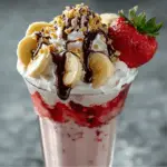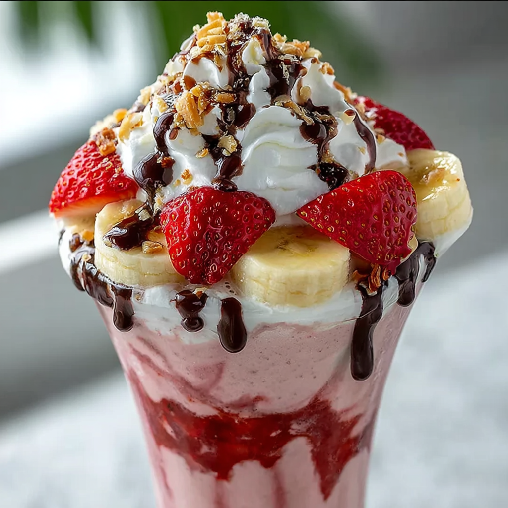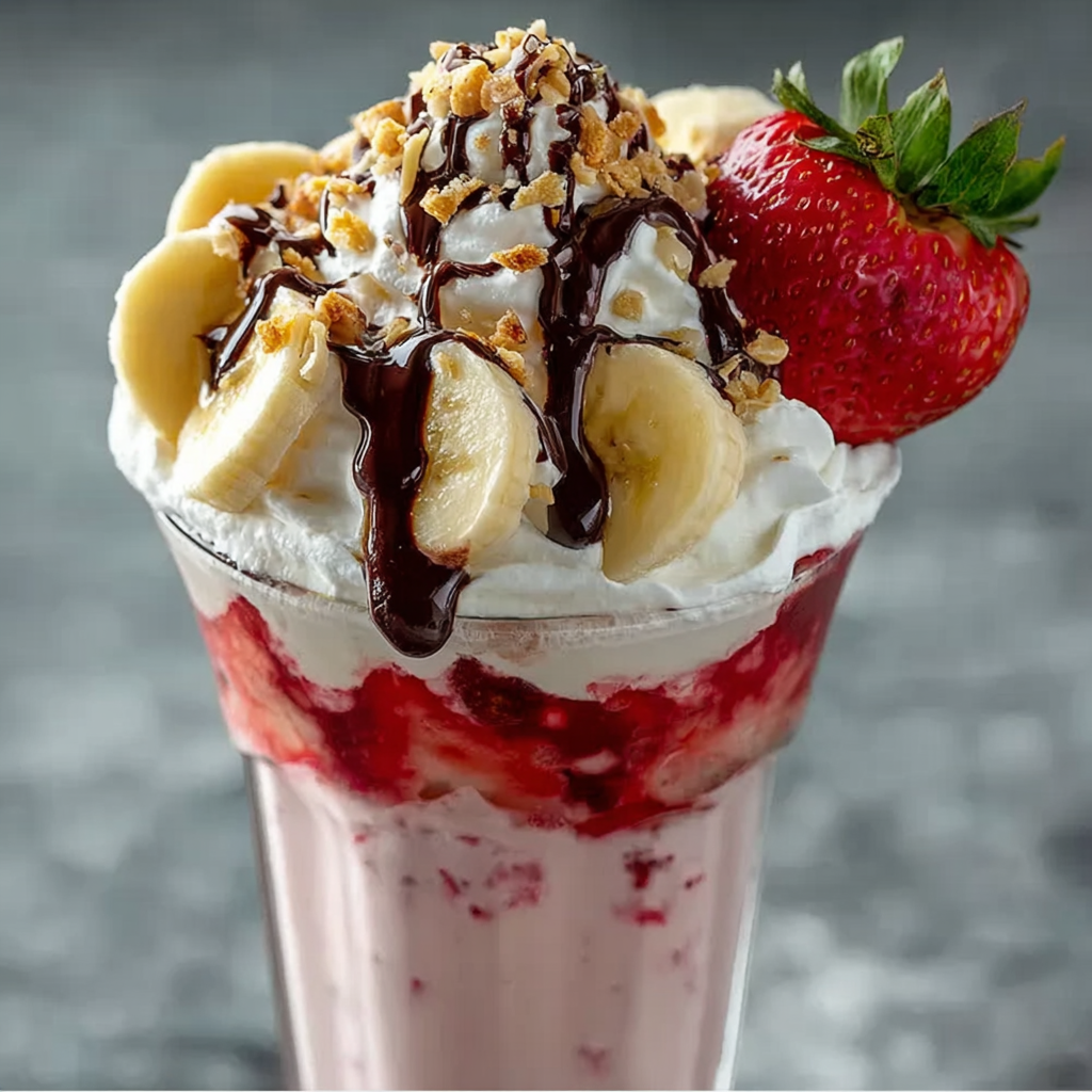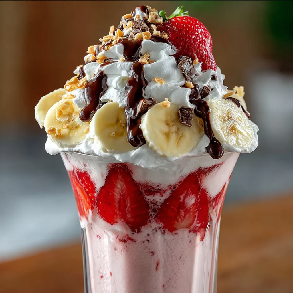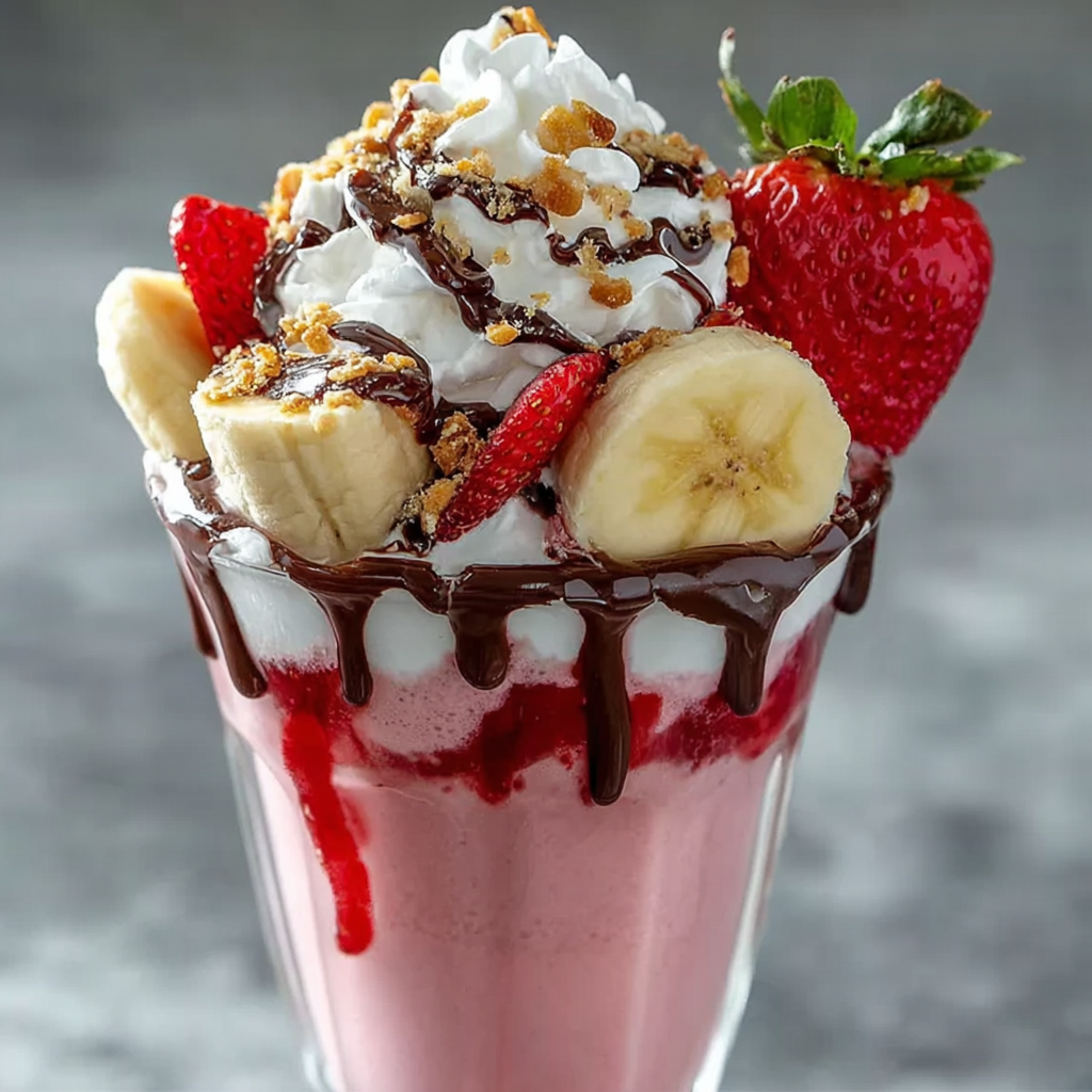 A creamy, nostalgic banana split milkshake that blends ripe bananas, vanilla, chocolate, and strawberry ice cream into one decadent drink. Swirled with rich chocolate syrup and sweet strawberry syrup, this milkshake is topped with whipped cream, a cherry, and your favorite sprinkles or nuts. It’s a drinkable version of the classic dessert—perfect for summer parties, retro nights, or a fun twist on milkshake recipes.