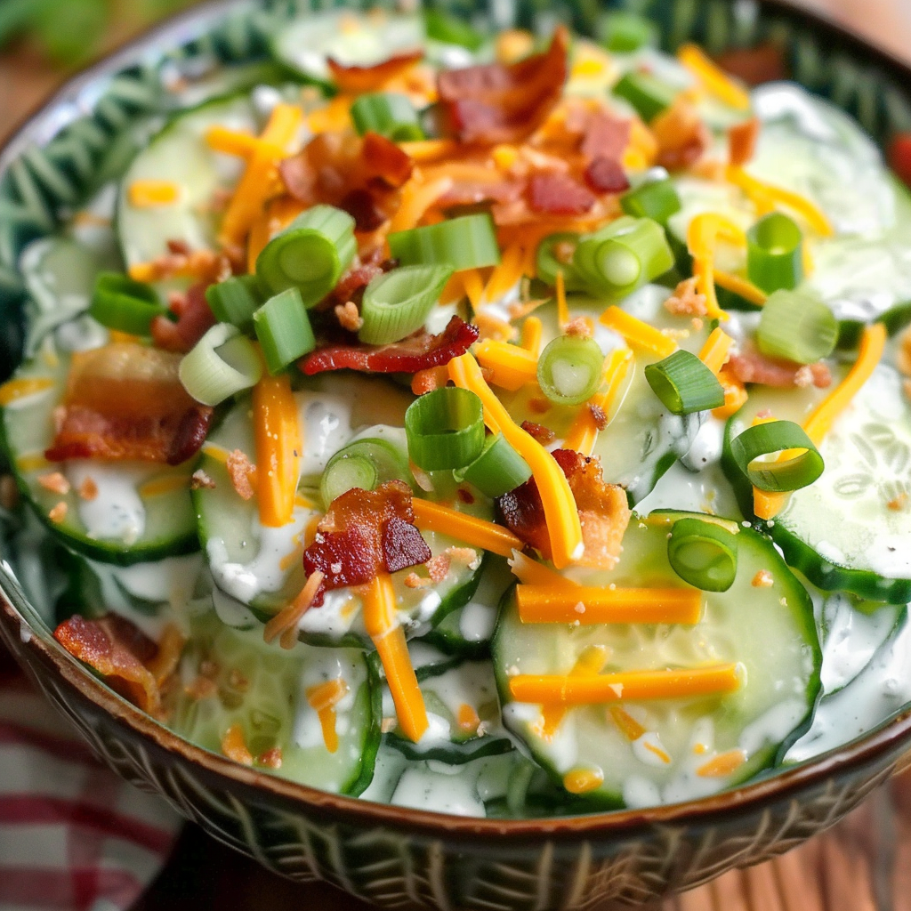 Cucumbers, the star of this salad, are naturally hydrating and low in calories. They pair perfectly with dairy-based dressings and salty toppings. According to Wikipedia, cucumbers are 95% water, making them a light, refreshing choice for summer meals. To enhance its richness, this version also incorporates cheddar cheese, bringing extra flavor and texture to the dish. If you’re interested in learning more about how cheddar complements cold dishes like this, you can explore its history and usage here.