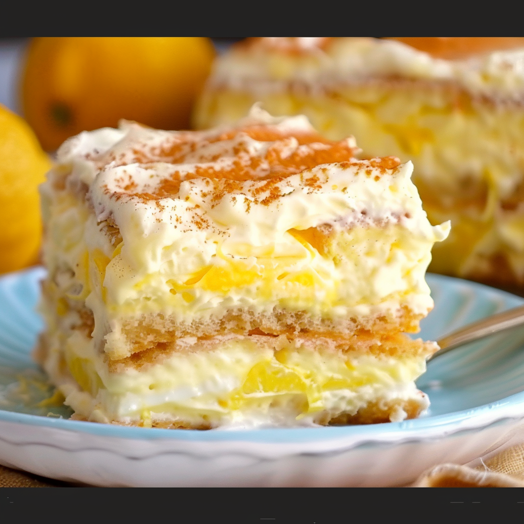 Lemon tiramisu is made with ladyfinger biscuits, lemon juice, lemon zest, mascarpone cheese, whipped cream, sugar, and vanilla extract. The classic coffee and cocoa flavors are replaced with bright citrus notes.