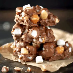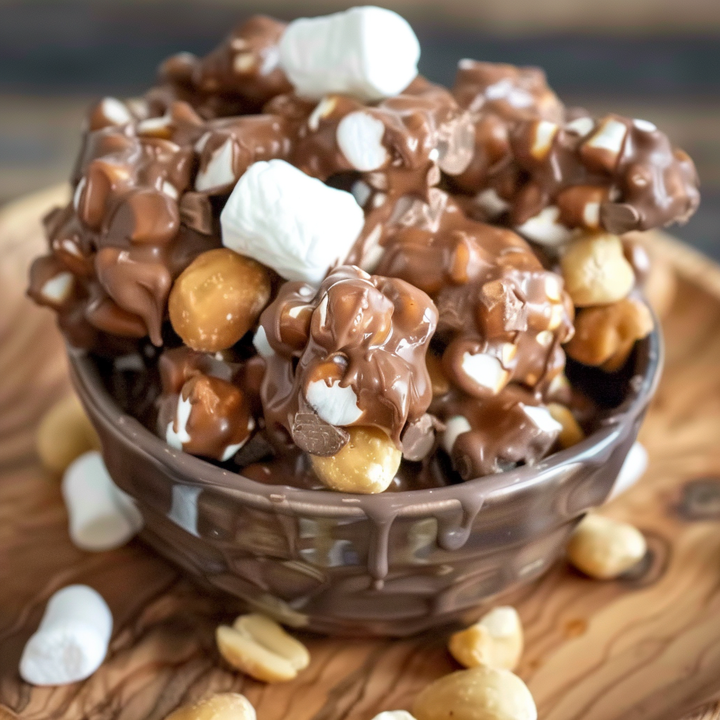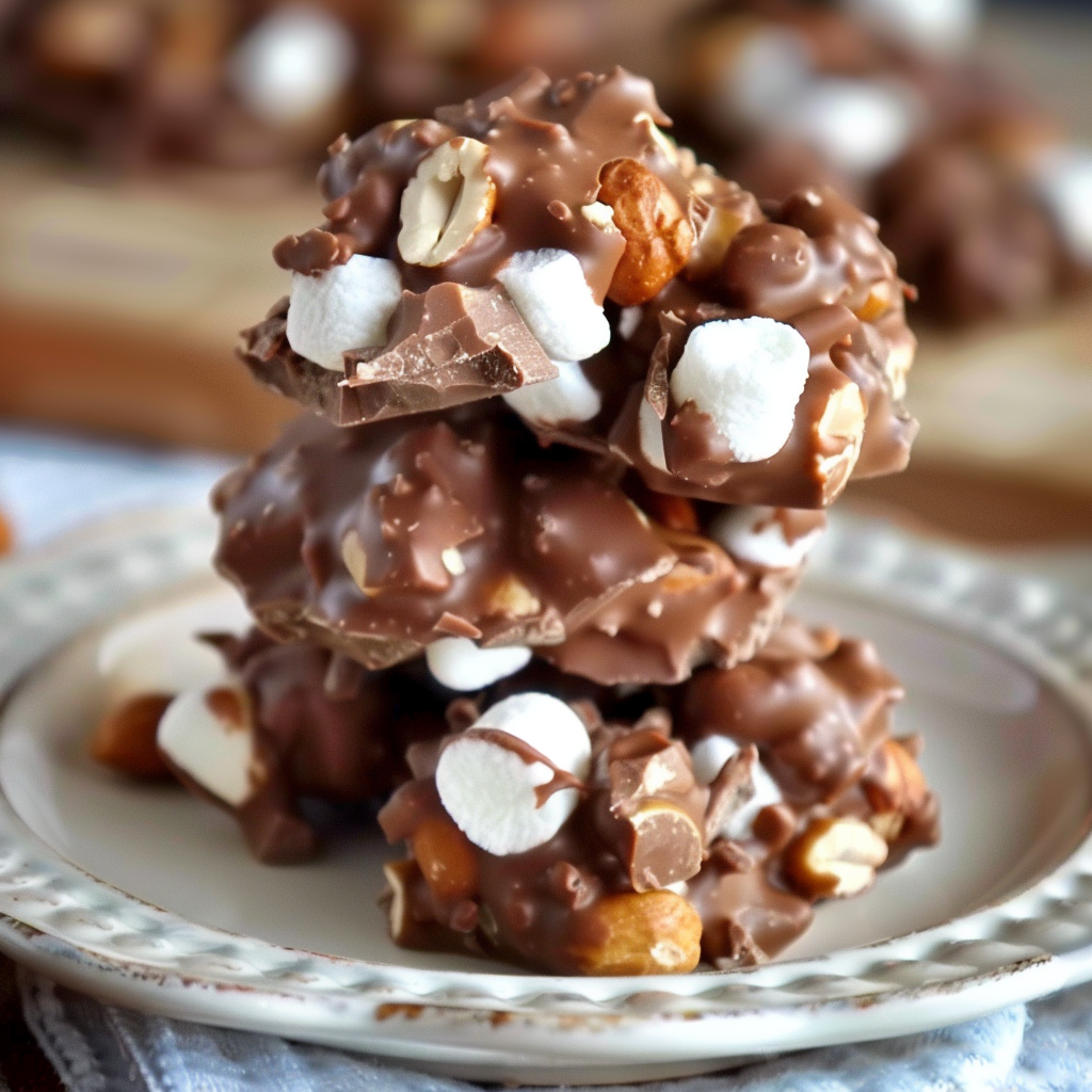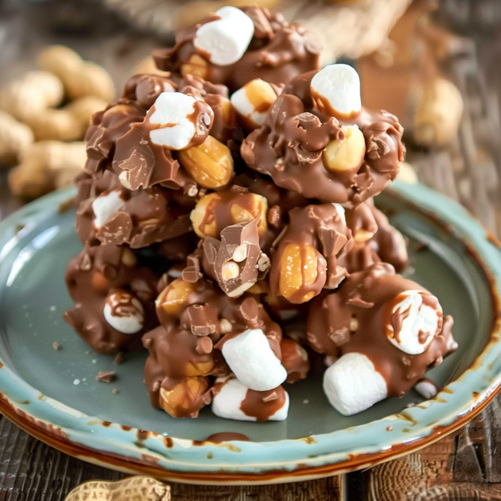 Rocky Road Peanut Cluster Candy is a delightful no-bake confection made with a mix of chocolate, peanuts, and marshmallows. It’s a simplified version of the classic Rocky Road dessert, which traditionally includes chocolate, marshmallows, and nuts—sometimes layered into fudge or baked into bars. In this variation, the ingredients are combined into bite-sized clusters, offering the same rich flavor and texture in a more snackable, shareable form.