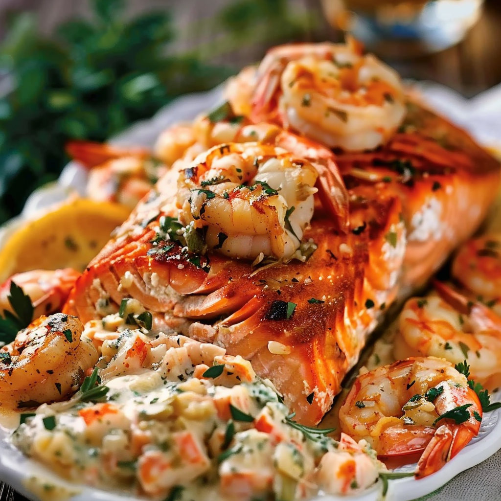 Crab and shrimp stuffed salmon is the perfect combination of luxurious seafood flavors and home-cooked comfort. This dish transforms ordinary salmon fillets into an elegant, restaurant-style seafood dinner that’s surprisingly easy to prepare. The creamy seafood stuffing, filled with lump crab meat, chopped shrimp, and aromatic herbs, adds a rich and savory twist to the natural flavors of baked salmon.