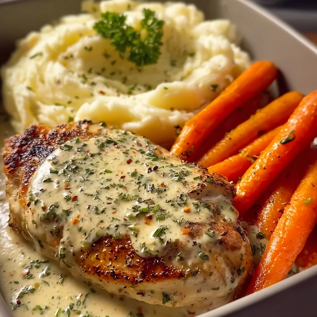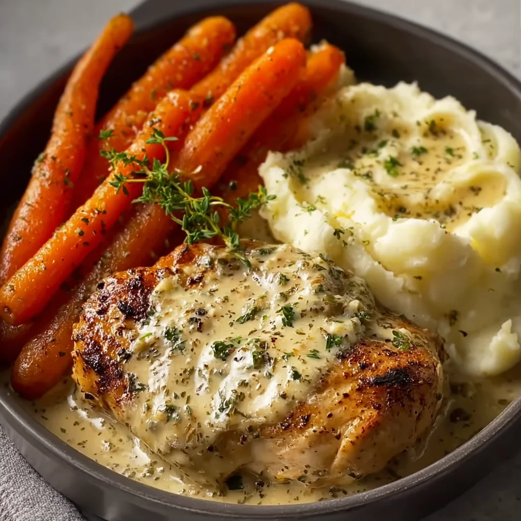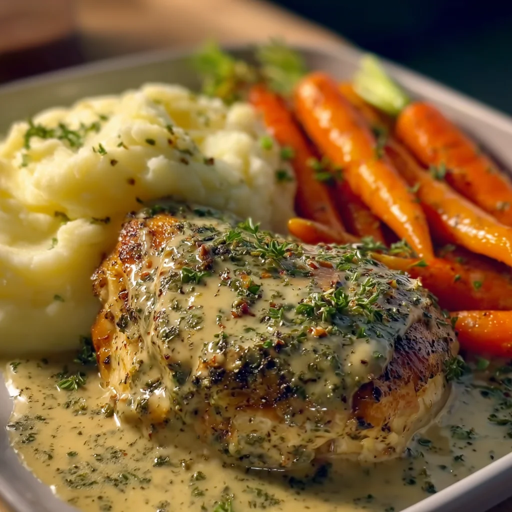Creamy Herb Chicken with Mashed Potatoes & Butter Carrots