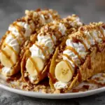 Crispy dessert tacos filled with buttery caramel-glazed bananas and toasted nuts, all tucked inside golden tortillas coated in cinnamon sugar. This easy sweet treat combines warm, gooey filling with a crunchy shell, making it a fun and delicious dessert that’s perfect for sharing at parties or enjoying as a quick homemade indulgence.