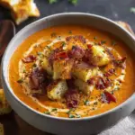 Creamy Tomato Bisque with Grilled Cheese Croutons is a rich, smooth soup made with crushed tomatoes, aromatics, herbs, and a touch of cream, then topped with golden, cheesy croutons made from grilled cheese sandwiches. This dish captures the ultimate comfort food experience with a sophisticated twist and is perfect for fall or chilly evenings.
