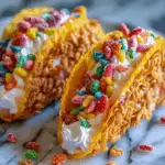 What sets these tacos apart from traditional sweets is the multi-layered texture and color. You get the satisfying crunch of a cereal shell — made by melting marshmallows and forming them into taco shapes — filled with a velvety cheesecake mixture. Whether you’re hosting a birthday bash, baby shower, or just want a weekend treat, this dessert fits right in. For even more inspiration, explore these dessert taco presentation ideas to elevate your next celebration.