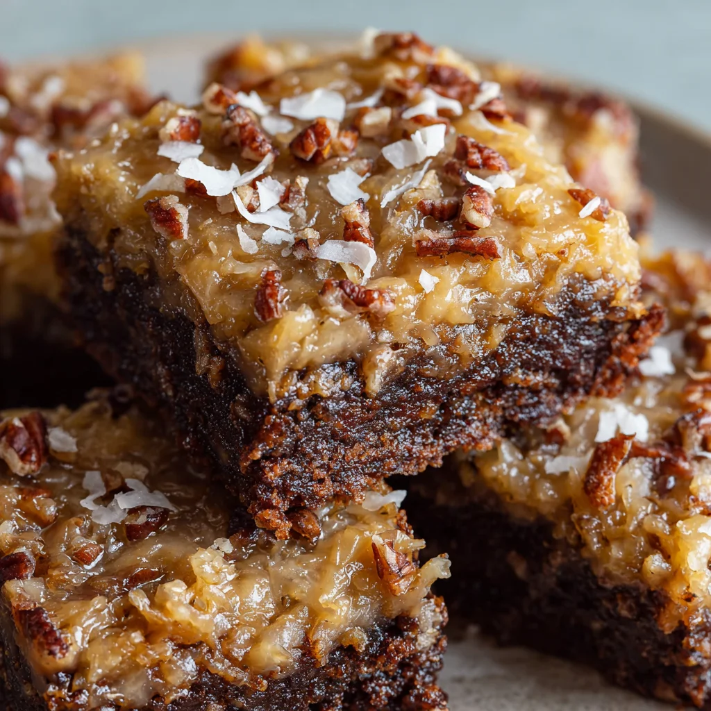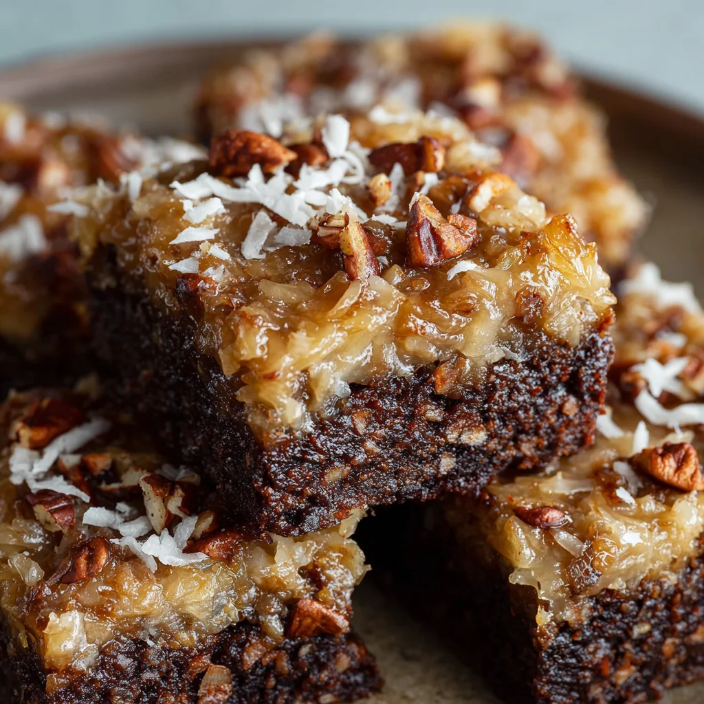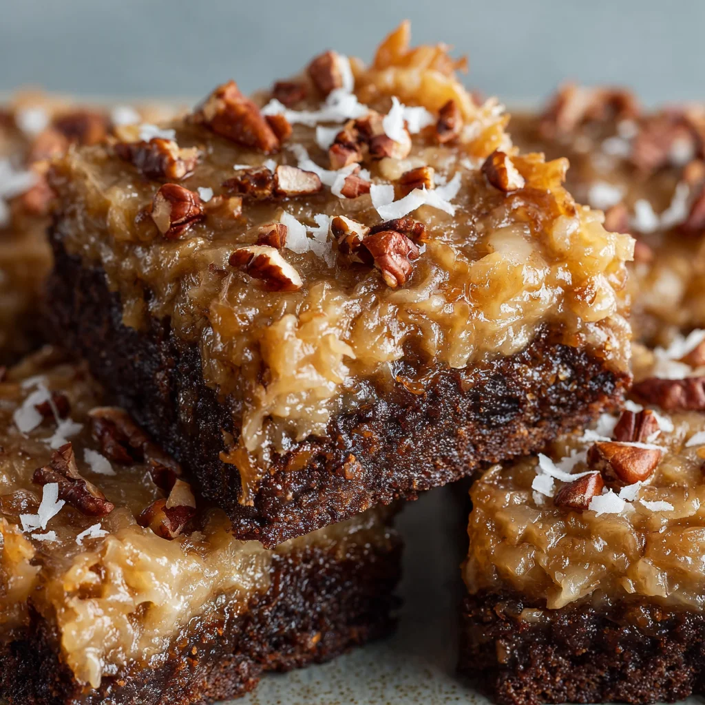 German Chocolate Brownies are a decadent twist on the classic brownie, combining the rich, fudgy texture of a traditional brownie with the distinctive coconut-pecan topping that defines German chocolate desserts. These brownies offer a perfect balance of deep chocolate flavor and the sweet, nutty crunch of the topping, making them an indulgent treat that’s perfect for any occasion.