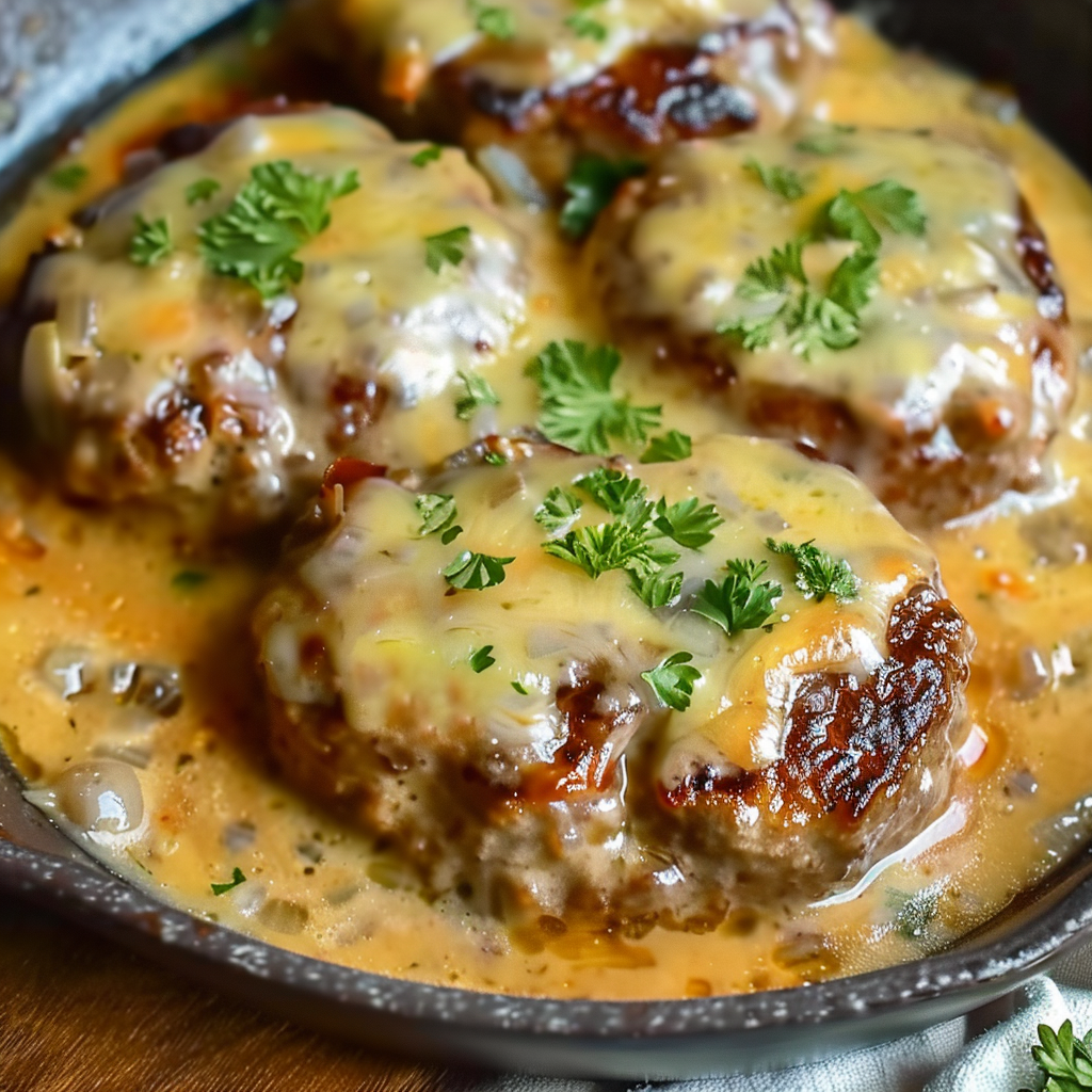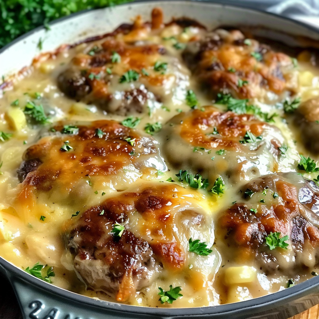 - Place the browned beef patties in a greased 9×13-inch baking dish. Pour the creamy onion sauce evenly over the patties.