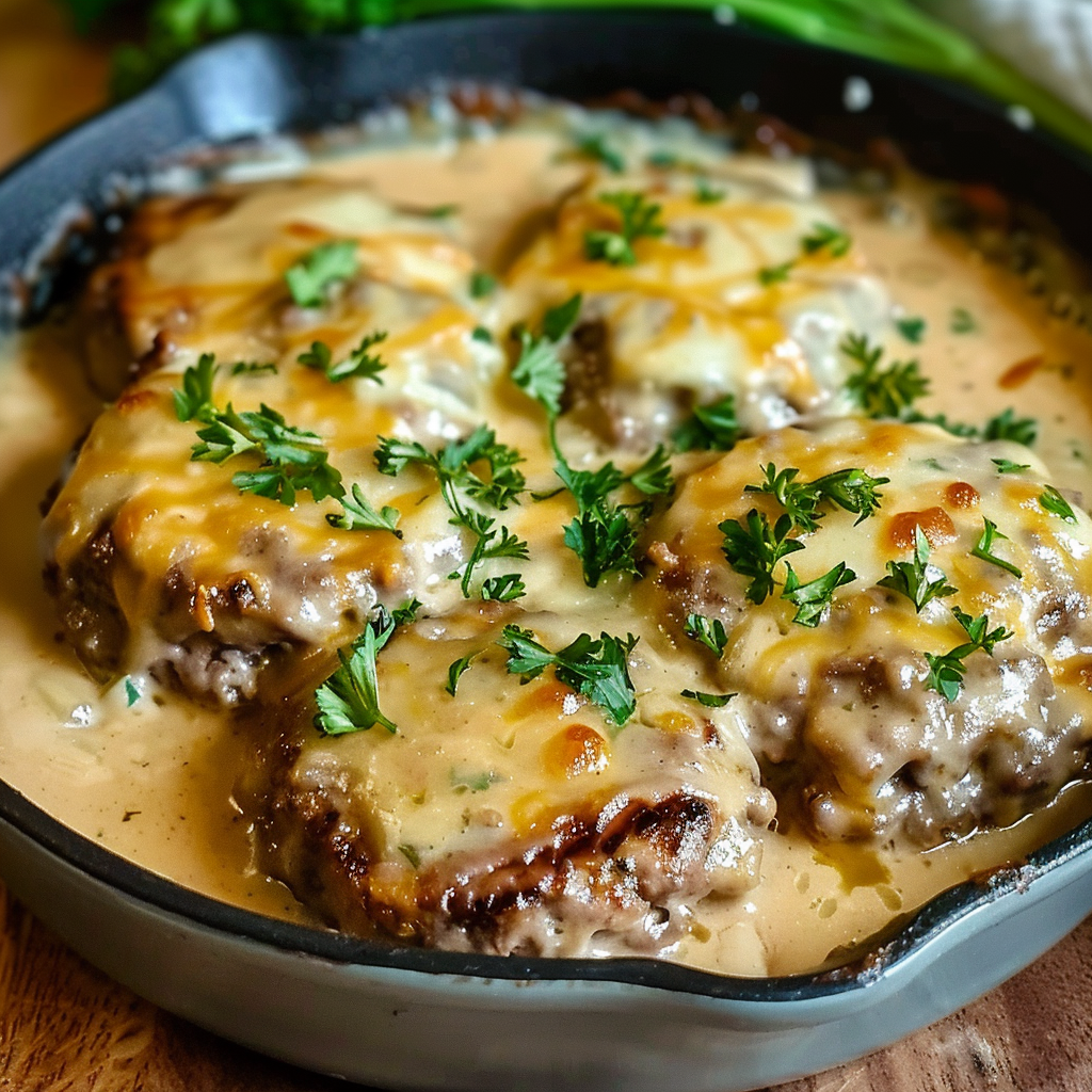 Another benefit lies in texture. Ground beef patties provide a tender, melt-in-your-mouth consistency that appeals to kids and adults alike. When baked in a creamy sauce, they soak up flavor beautifully and stay moist — unlike some steak cuts that can become tough when overcooked. This technique is inspired by dishes like Salisbury steak, which uses similar methods to transform simple ingredients into rich, comforting meals.