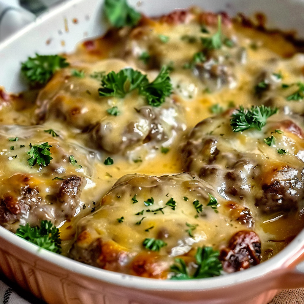 In recipes like this, ground beef acts as a canvas for the sauce. As the dish bakes, the beef absorbs the creamy onion and broth mixture, locking in moisture and flavor. This process is similar to how béchamel sauce enhances casseroles — a foundational method described in white sauce base techniques used in French and American cooking.