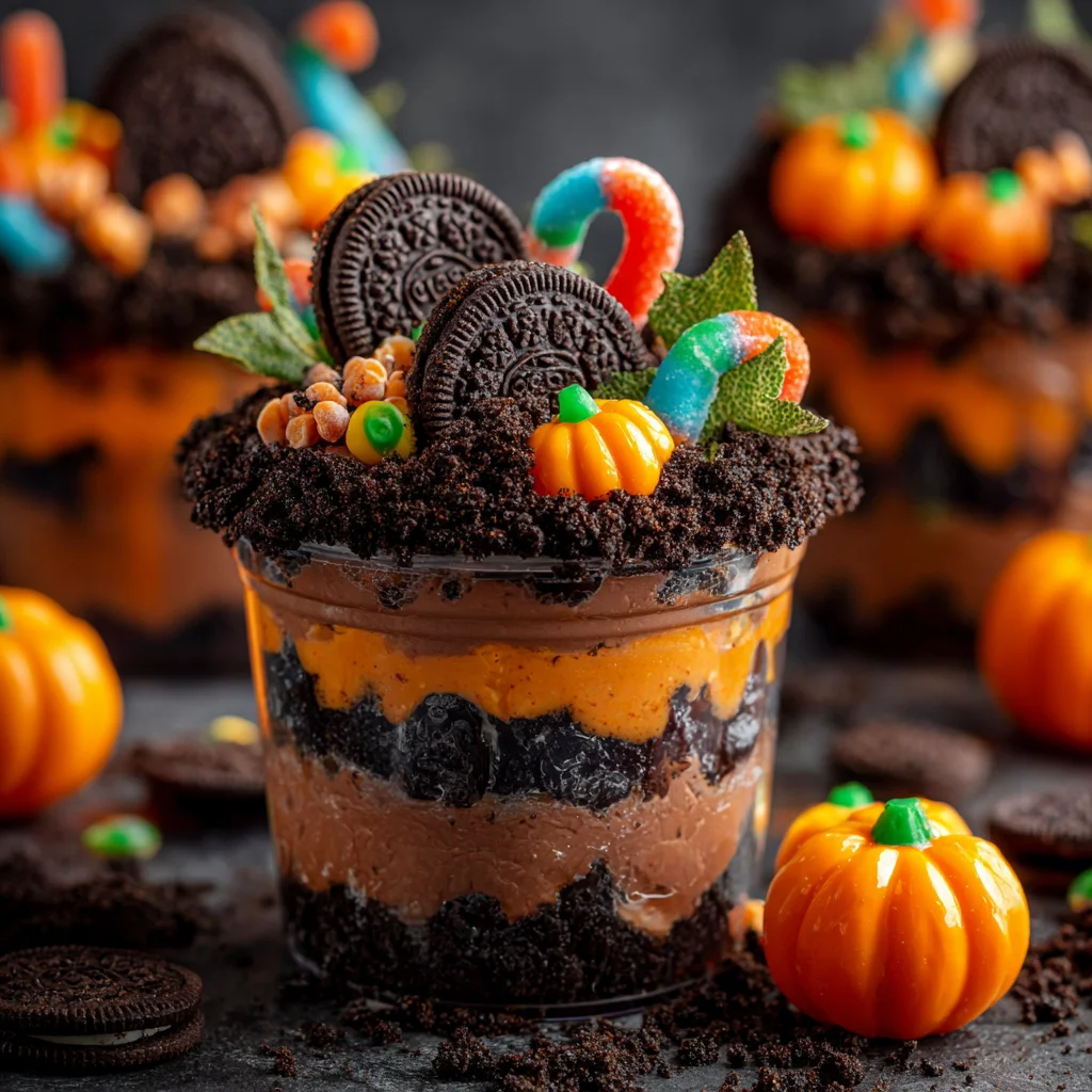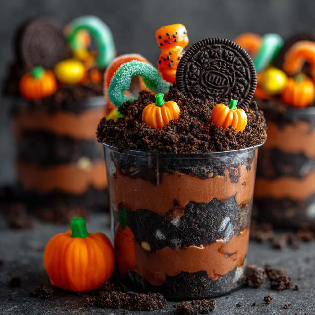 Dirt cups are typically made of crushed chocolate cookies (like Oreos), chocolate pudding, and whipped topping. For Halloween versions, they include candies and cookies as decorations.