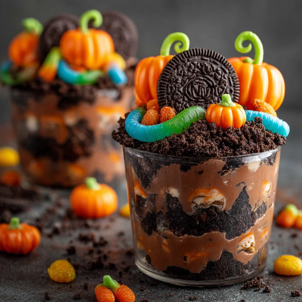 These frightful treats are inspired by classic dirt pudding cups, a nostalgic dessert with many variations. According to Wikipedia’s article on pudding, this kind of dessert originated from traditional custards and has evolved into easy-to-make versions using instant mixes. Paired with store-bought or homemade cookie crumbs and topped with candies, Halloween dirt cups have become a Pinterest favorite as seen on Halloween dessert cups.