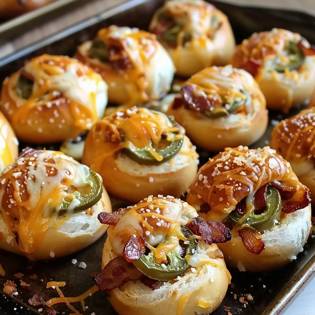 This recipe is all about combining simple ingredients with clever technique. Thanks to store-bought refrigerated biscuit dough and a quick baking soda bath, you can recreate the signature texture of a soft pretzel without the need for long rising times or specialty equipment. The filling, a blend of cheddar cheese, pickled jalapeños, cream cheese, and chopped turkey bacon, offers a balance of creamy, smoky, and spicy.