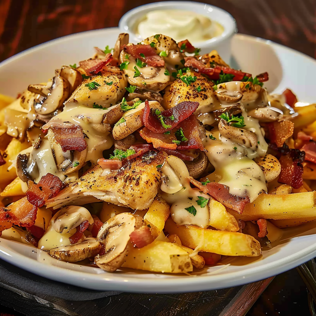 This recipe stands out because it transforms simple ingredients into a crispy, cheesy, protein-packed meal that works for weeknights, gatherings, or last‑minute cravings. The combination of seasoned fries, juicy chicken, smoky turkey bacon, and tender mushrooms delivers layered flavor without requiring advanced cooking skills or long prep time.