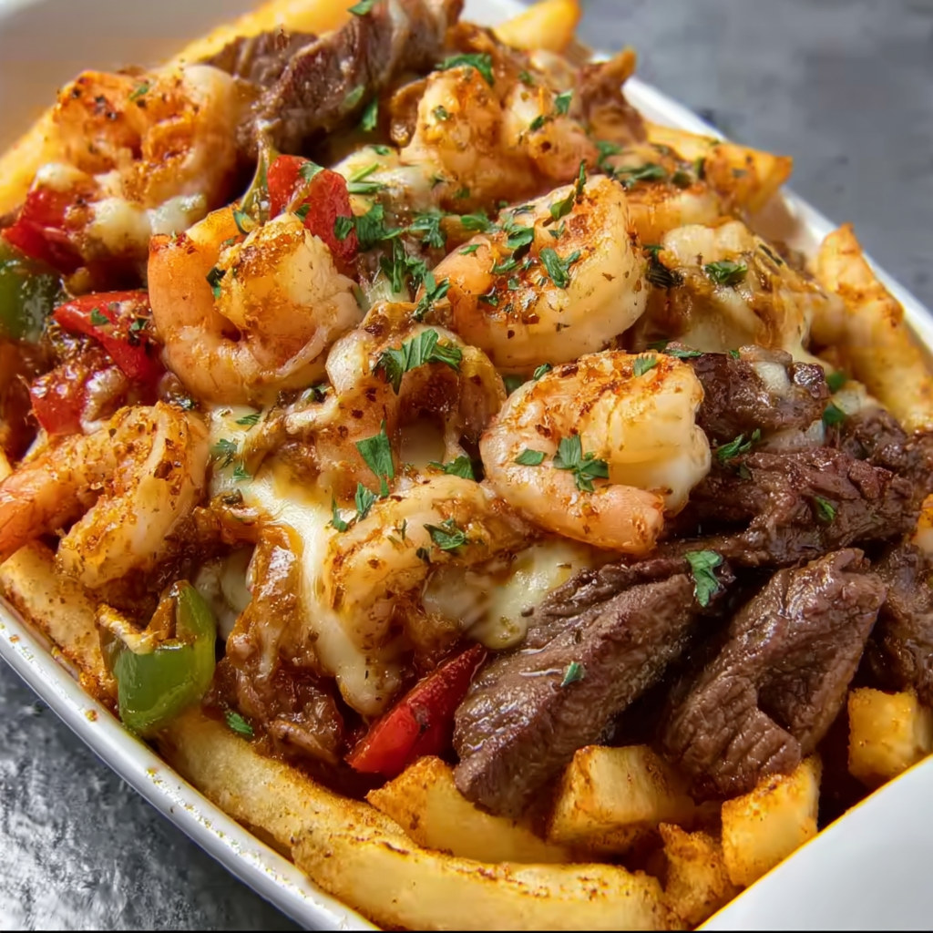 The Bayou-style version adds a regional twist to the concept. In this case, Cajun-spiced shrimp and seared steak are the stars, delivering that unmistakable Louisiana heat and flavor. These fries are deeply influenced by the bold seasoning profiles found in Cajun cuisine (source), which often includes a blend of paprika, garlic powder, cayenne, and black pepper.