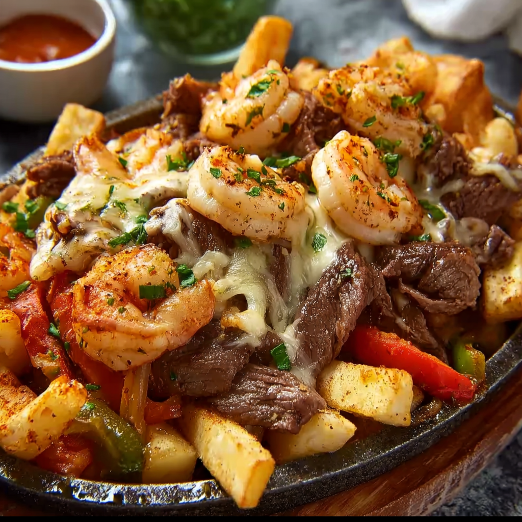 These Bayou-style surf & turf loaded fries are the ultimate comfort food, combining crispy fries with Cajun-spiced shrimp, tender steak, melty cheese, and fresh toppings. Perfect for game day, parties, or a bold weeknight dinner, this dish brings the flavors of Louisiana straight to your kitchen.