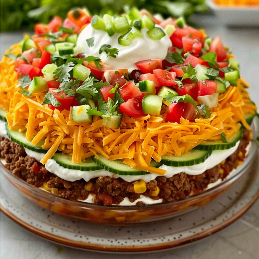 Each layer plays a specific role. The base is usually made with refried beans, either plain or seasoned with taco seasoning to infuse bold flavor. You can read more about refried beans on Wikipedia, a staple in many Mexican cuisine dishes. Next comes a cool and tangy sour cream layer, followed by creamy guacamole, zesty salsa, shredded lettuce, cheddar cheese, and garnishes like olives, tomatoes, and green onions. It’s a dish that balances creaminess, crunch, and spice in every bite.