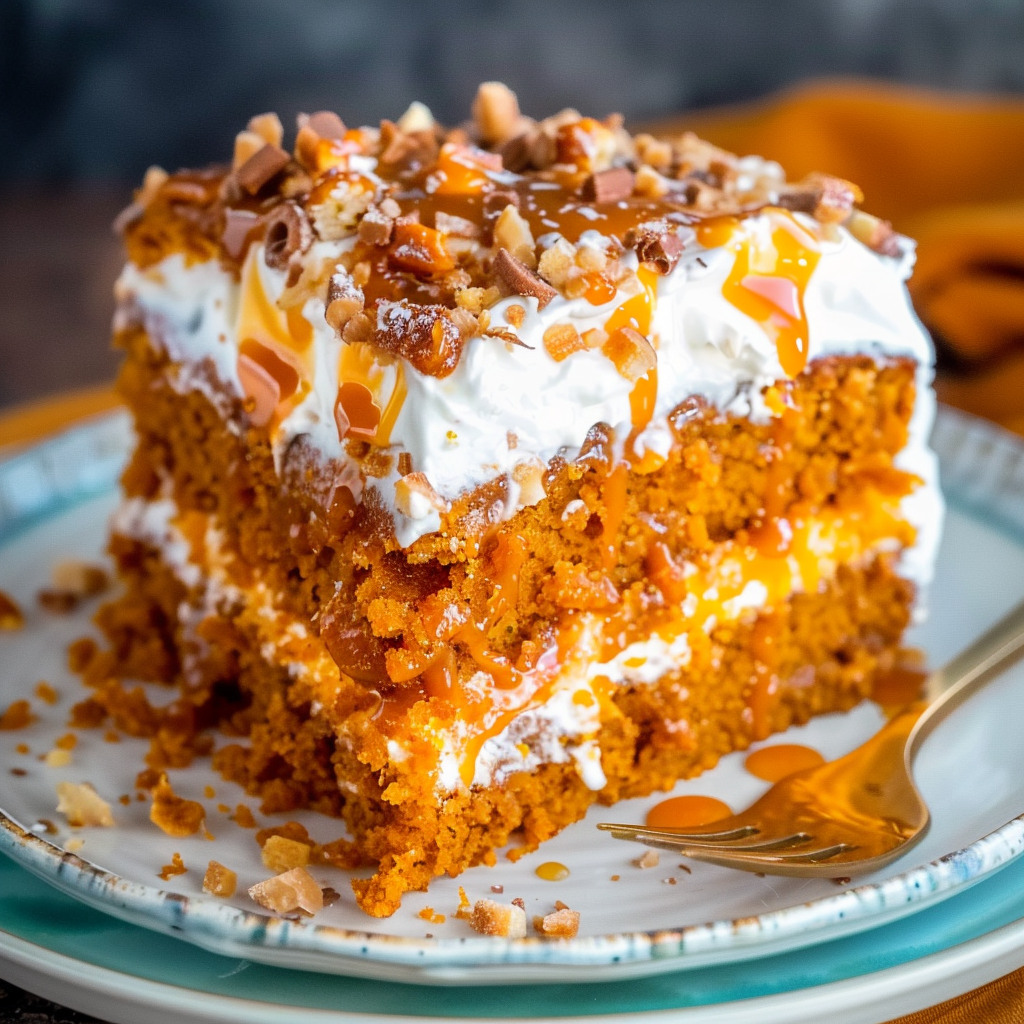 The pumpkin poke cake is a quick, crowd-pleasing dessert made with just a few ingredients—ideal when you need something festive but don’t want to bake from scratch. The use of yellow cake mix simplifies the process, while the spiced filling and creamy topping add layers of indulgent flavor.