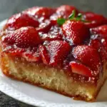 Can I use frozen strawberries in upside down cake? Yes, but thaw and drain them thoroughly. Frozen strawberries release more water, so increase the cornstarch to avoid a soggy topping. Why is my upside down cake soggy? This can happen if the fruit releases too much liquid. Use cornstarch to thicken the fruit mixture and avoid overbaking, which can cause the bottom to steam instead of caramelize. Can I make this cake ahead of time? Yes, the cake can be made 1–2 days in advance. Store it covered in the fridge and bring to room temperature before serving. What type of pan works best for upside down cakes? A 9-inch round cake pan is ideal. Avoid using a springform pan, as the fruit juices can leak during baking. How do I stop the fruit from sticking to the pan? Use parchment paper on the bottom of the pan and grease the sides well. This ensures a clean release when flipping the cake. PrintMoist Strawberry Upside Down Cake – A Summery Crowd-Pleaser