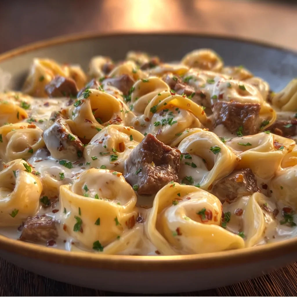 Tortellini, an Italian pasta filled with cheese or meat, is an excellent base for this dish because it brings both flavor and structure. The chewy bite of pasta, combined with its cheesy center, enhances the richness of the steak and vegetables.