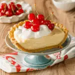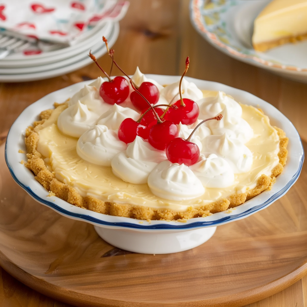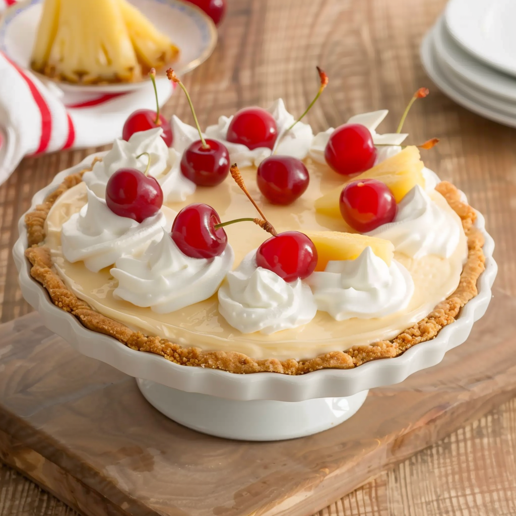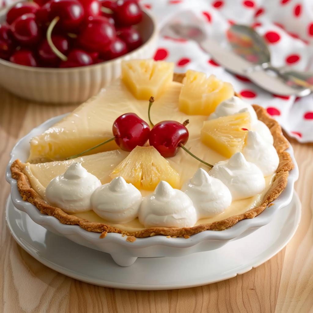 Inspired by the iconic upside-down cake, this variation layers pineapple slices and maraschino cherries on the bottom of the crust before pouring in the filling. Once baked and inverted, it reveals a glossy, caramelized top. It combines the nostalgia of pineapple upside-down cake with the texture and sliceability of a pie, making it a showstopper on any dessert table.