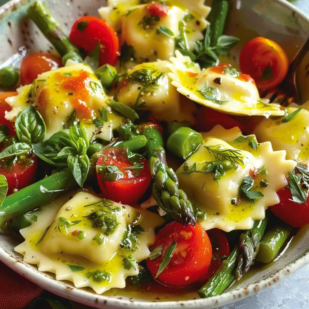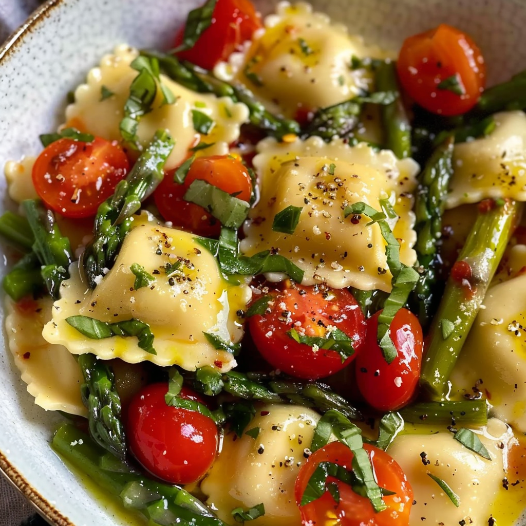 A quick and vibrant cheese ravioli recipe with sautéed cherry tomatoes, asparagus, garlic, and fresh herbs. Finished with Parmesan cheese and a light olive oil-based sauce, this one-pan pasta dish is perfect for busy weeknights or casual dinner parties. Fast, fresh, and full of flavor.