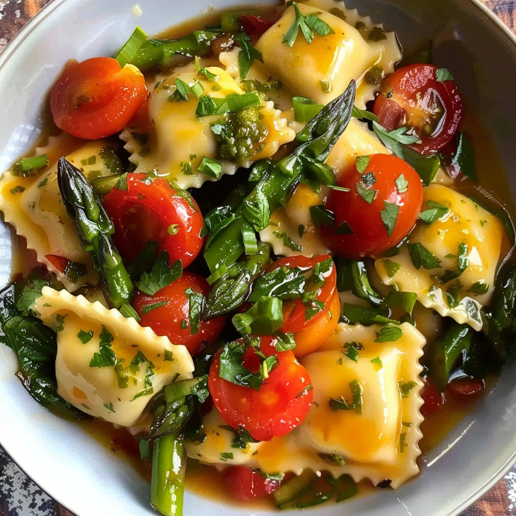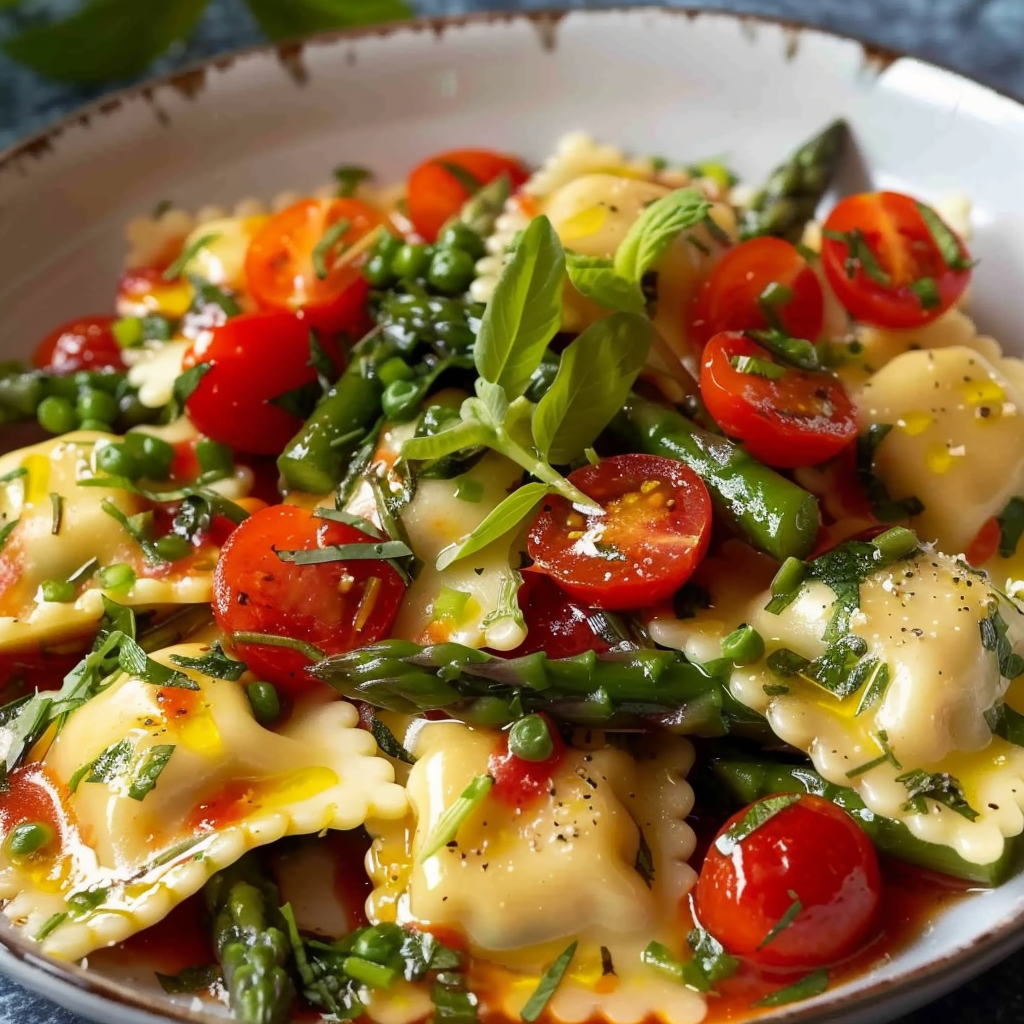 A quick and vibrant cheese ravioli recipe with sautéed cherry tomatoes, asparagus, garlic, and fresh herbs. Finished with Parmesan cheese and a light olive oil-based sauce, this one-pan pasta dish is perfect for busy weeknights or casual dinner parties. Fast, fresh, and full of flavor.