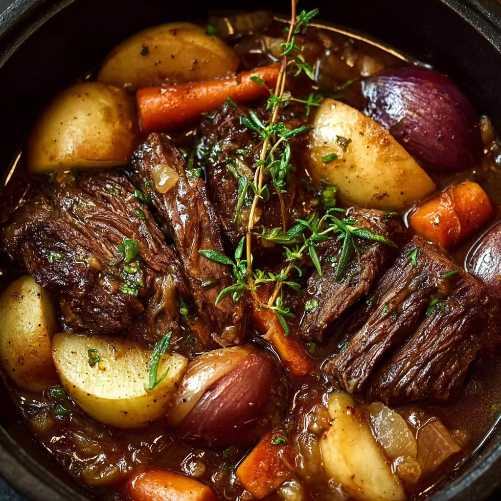 The non-alcoholic apple cider used here adds a natural sweetness and gentle acidity. It’s different from apple juice—less filtered, richer in flavor, and often made from a mix of apple varieties. Apple cider not only enhances the taste but also helps break down the tough fibers in beef. If you’re out of cider, consider low-sugar apple juice or even a mix of broth and a splash of apple cider vinegar as a backup. For additional inspiration, check apple cider recipes on Pinterest.