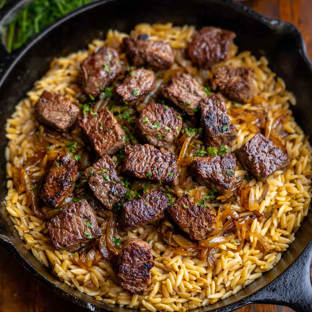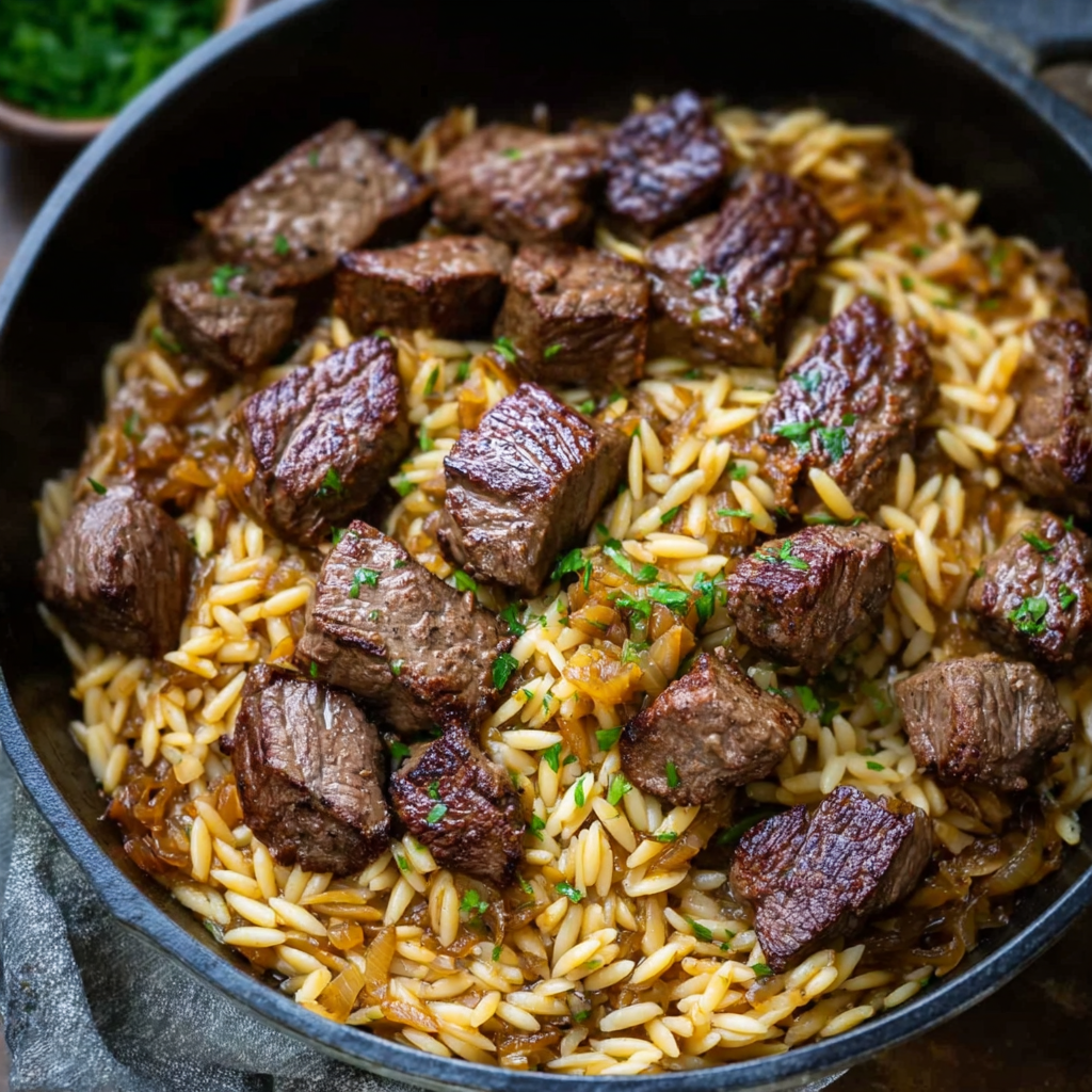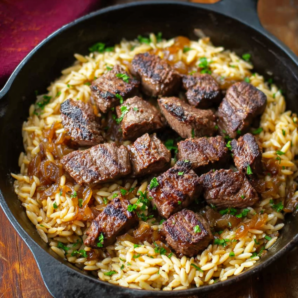 This One-Pan Steak and Caramelized Onion Orzo is a creamy, savory, and indulgent dinner made in a single skillet. Featuring tender seared steak, sweet caramelized onions, toasted orzo, and a Parmesan-laced broth, it’s perfect for busy weeknights or cozy date nights. A quick, satisfying meal that delivers the comfort of pasta with the bold flavors of a steakhouse classic—all in under an hour.