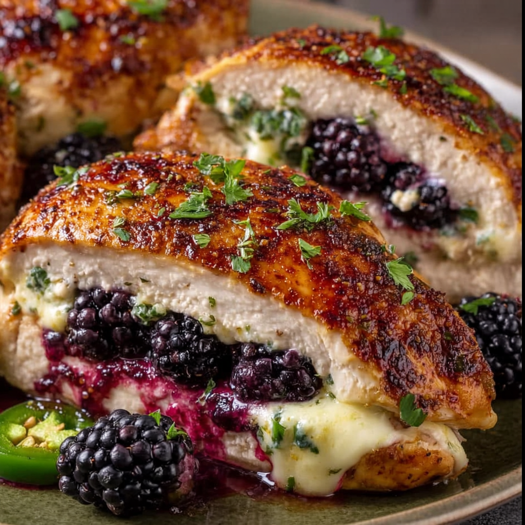 A bold and unforgettable dish, Blackberry Jalapeño Chicken features pan-seared chicken breasts baked in a sweet, spicy glaze made from blackberry preserves and jalapeños. Topped with melty mozzarella cheese, this easy one-skillet recipe brings gourmet flavor to your kitchen with minimal prep. Finished with fresh herbs and optional blackberries for garnish, it’s perfect for both casual dinners and special occasions.