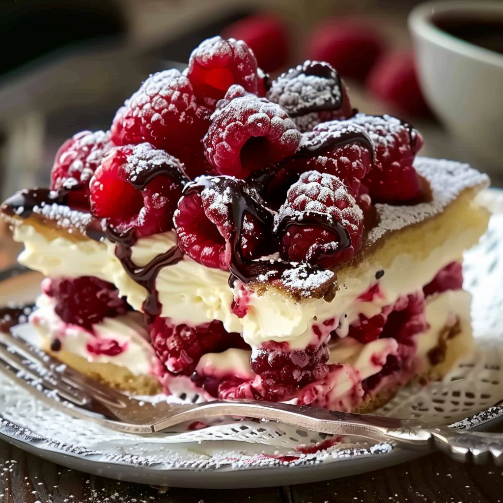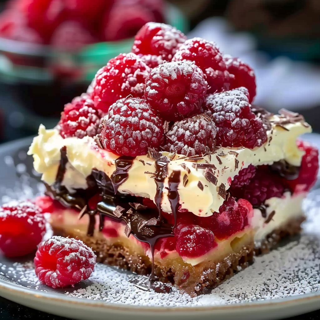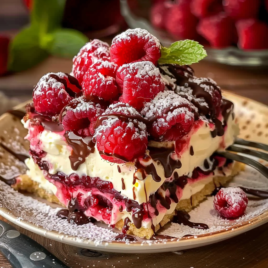 Before serving, garnish with fresh raspberries, a light dusting of powdered sugar, and optional mint or shaved white chocolate.