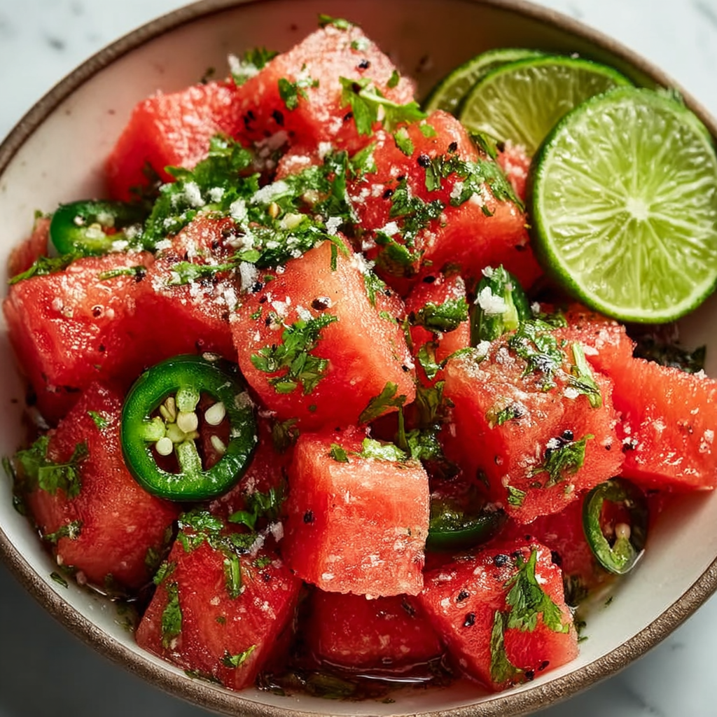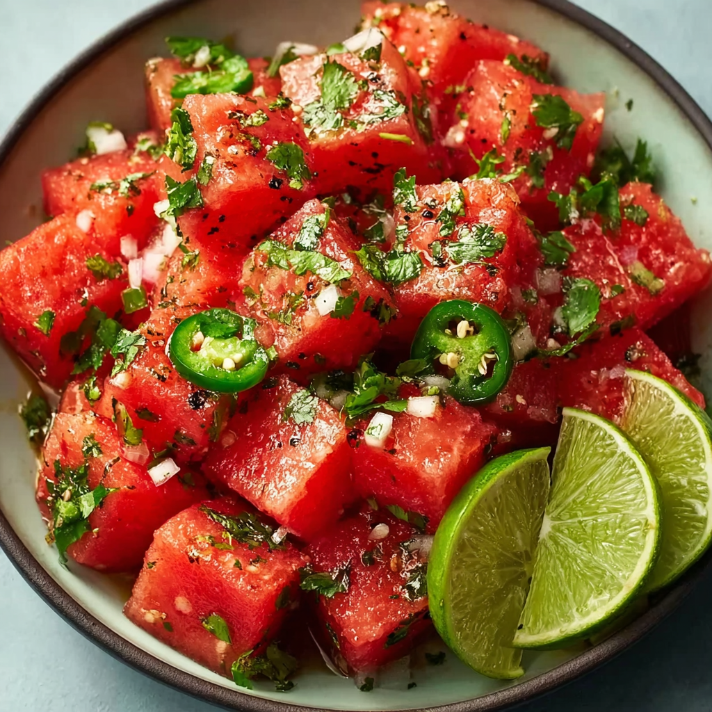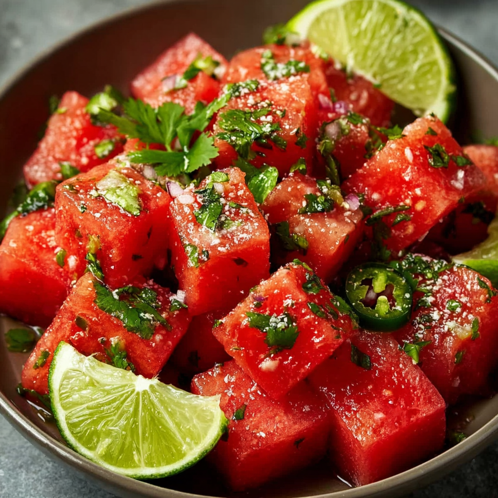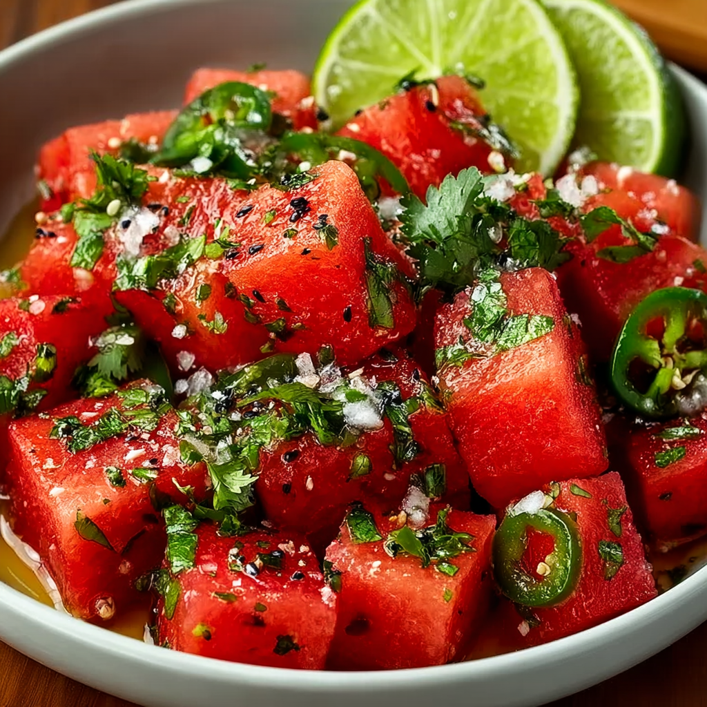 A bold and refreshing summer salad featuring juicy watermelon, zesty lime, fresh cilantro, and a touch of chili heat. This vibrant dish comes together in minutes and is perfect for outdoor gatherings, barbecues, or light lunches. Optional toppings like feta cheese and avocado add richness and make it easy to customize.