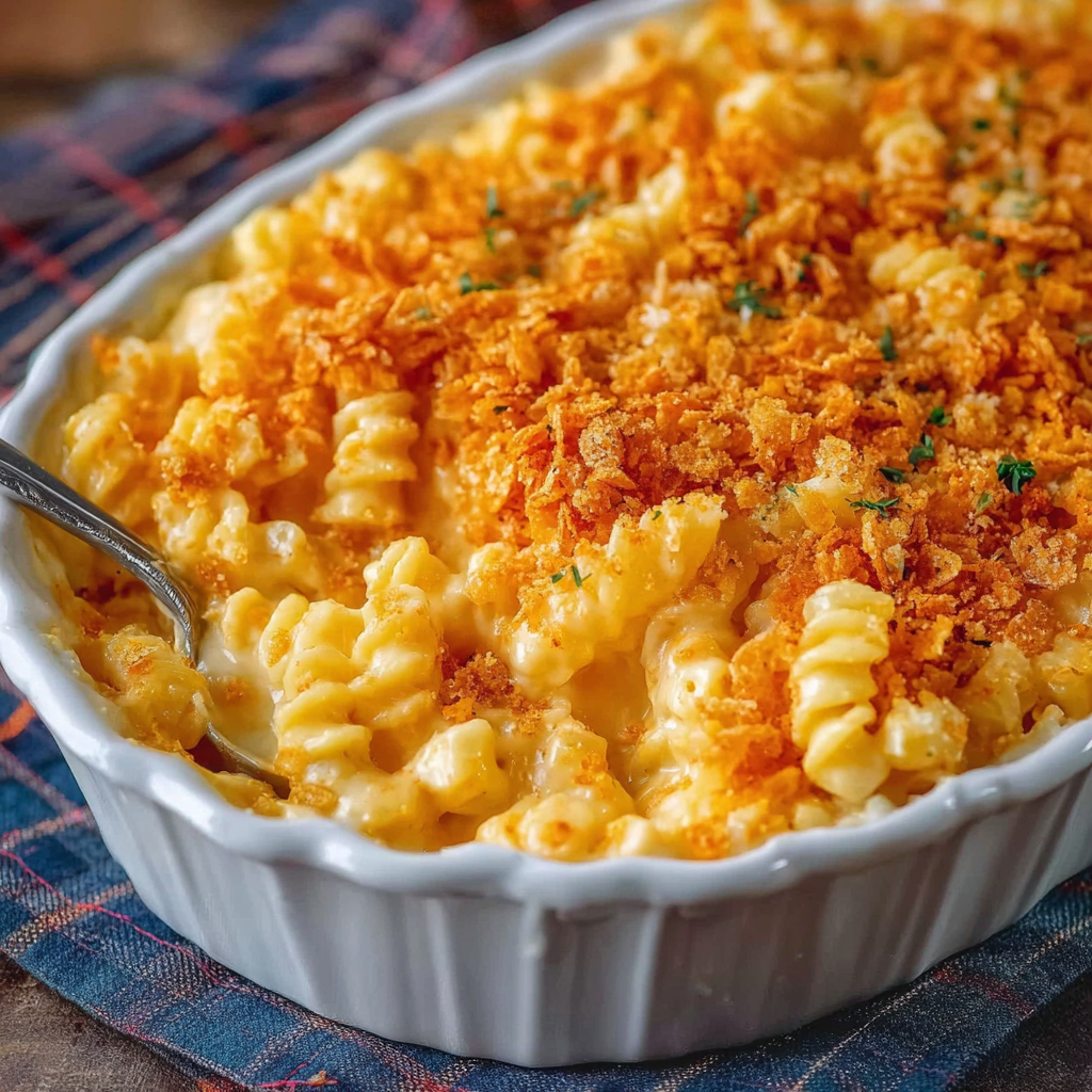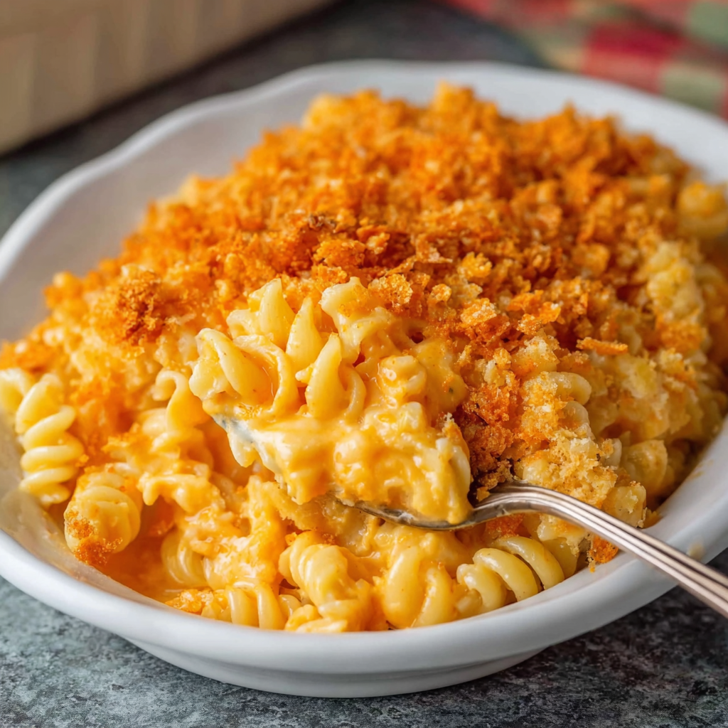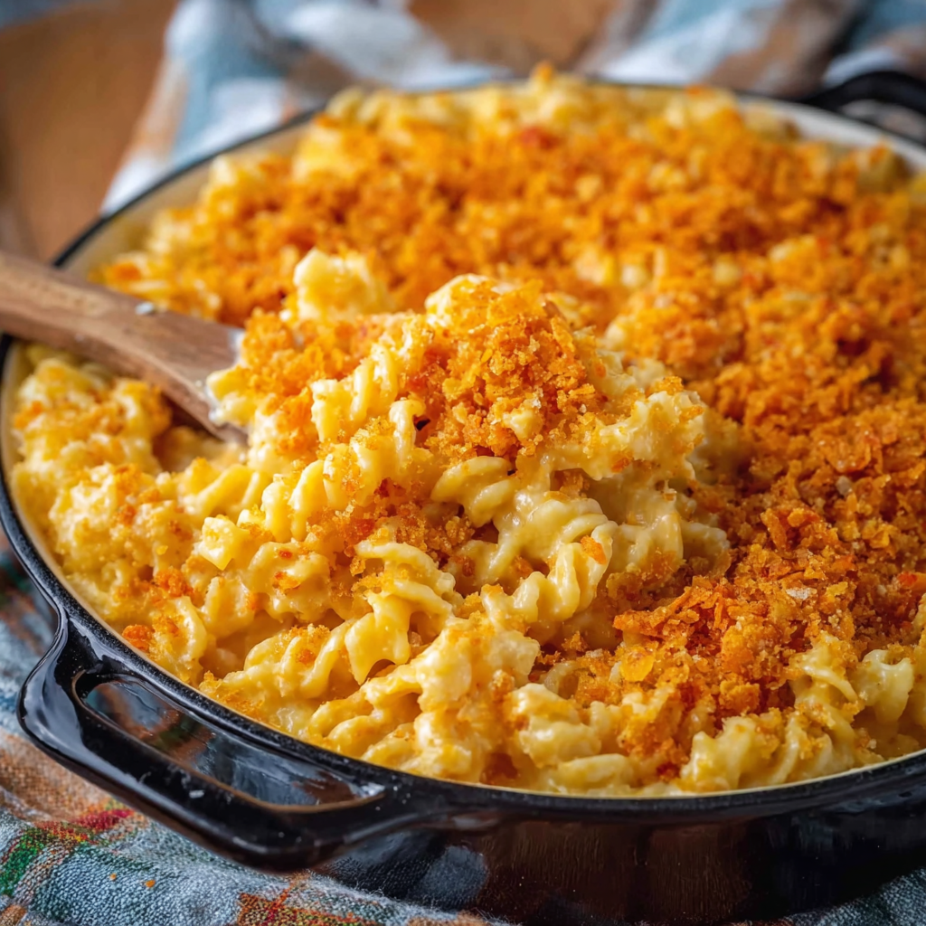 A creamy, cheesy pasta dish topped with crunchy Dorito-style chips for a bold and flavorful twist on classic mac and cheese.